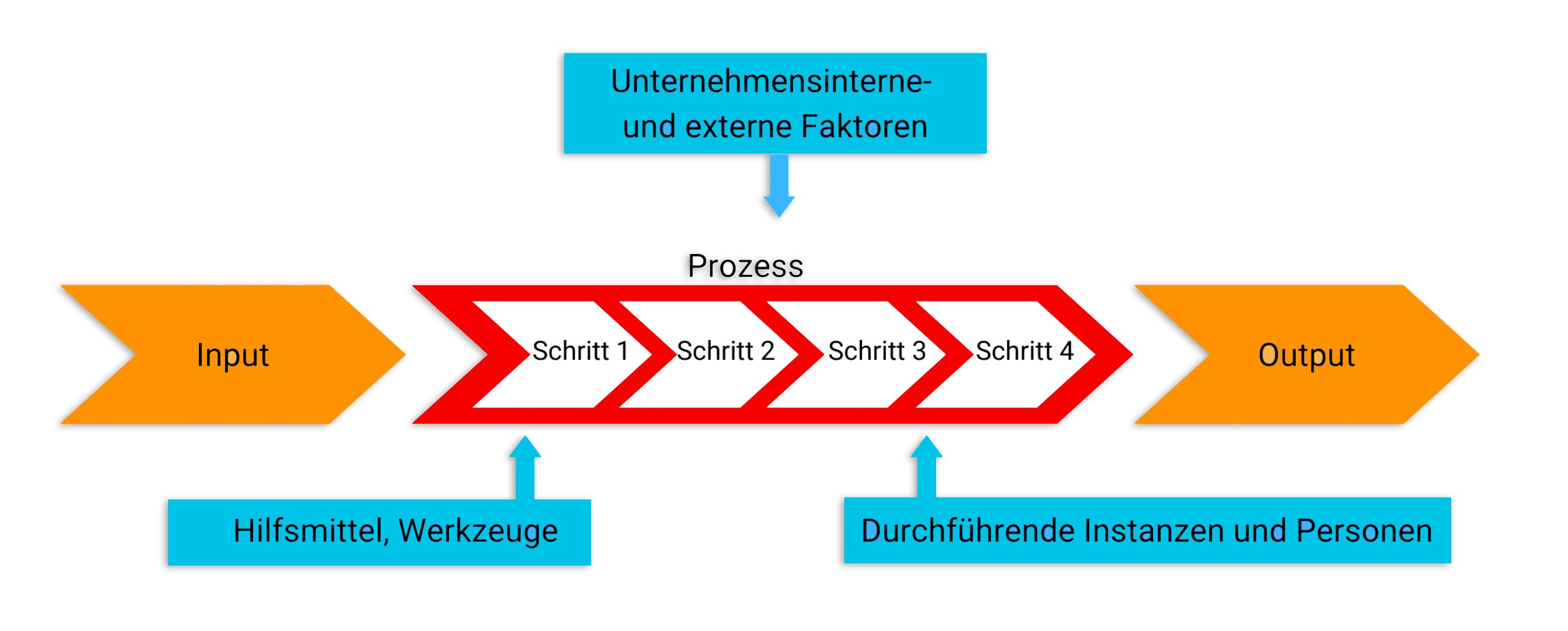 Definition Prozess:>br> Unternehmensprozesse sind Abläufe, Arbeitsschritte, Vorgehensweisen und Handlungen, die in einer sich wiederholenden Reihenfolge stattfinden. Um Prozesse sinnvoll abzubilden, sind sowohl der Beginn ("Input") als auch das Ende ("Output") zu definieren.